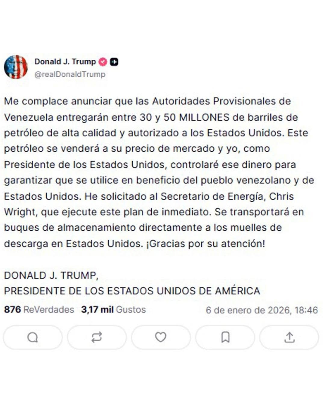 La noticia fue dada a conocer por el mandatario en su cuenta de Truth Social, calificando los barriles como «petróleo de alta calidad», cuyas ganancias se utilizarán «en beneficio del pueblo venezolano y de Estados Unidos».