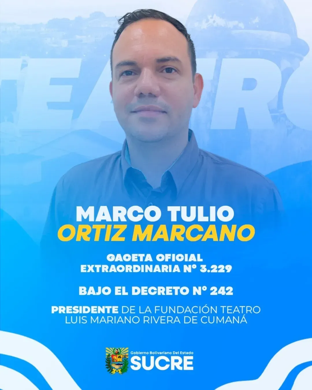 La Gobernación del estado Sucre anunció el martes, 13 de enero, la designación del escritor Marco Tulio Ortiz Marcano como presidente de la Fundación Teatro Luis Mariano Rivera.