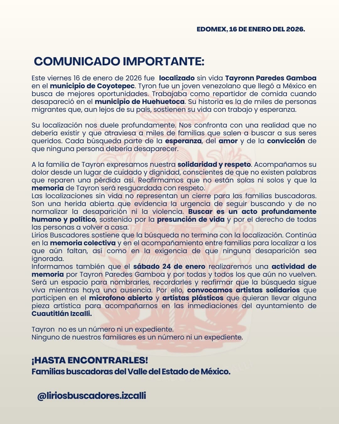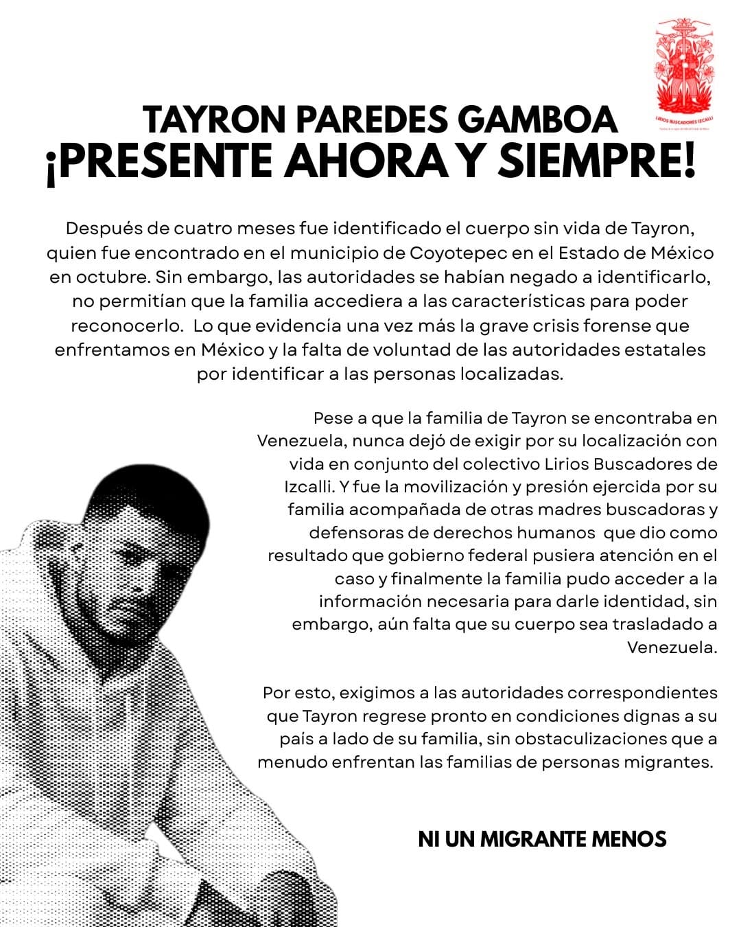 «Después de cuatro meses se identificaron los restos de Tayron. Los organismos se habían negado a identificarlo y no permitían que la familia accediera a las pruebas para confirmar que se tratara de él, lo que evidencia una vez más la grave crisis que enfrentamos en nuestro país», declaró la organización en su cuenta de Instagram.